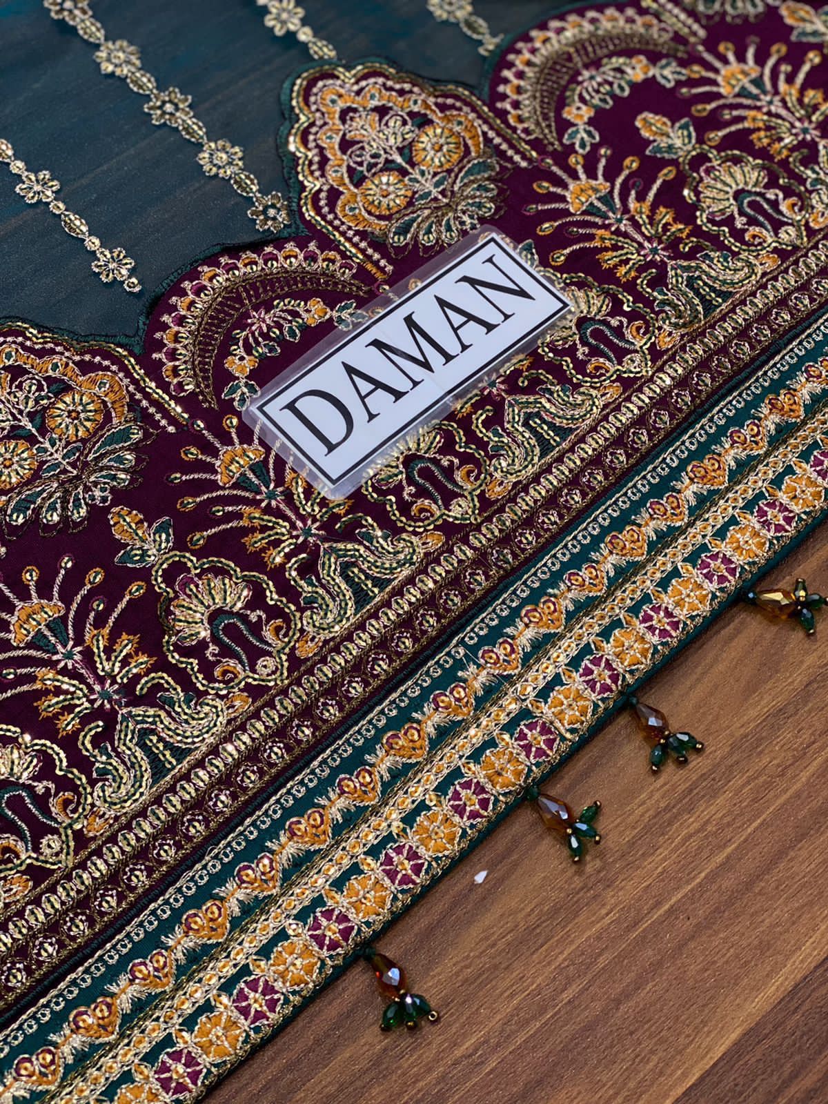 * FRONT: Full Embroidered With Sequence Work, Attached Daman With Tussles Attached